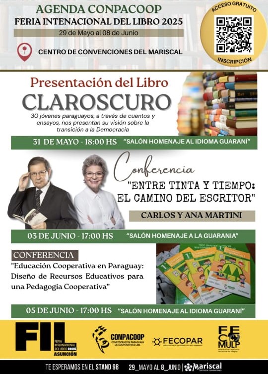 La CONPACOOP estará presente en la Feria Internacional del Libro con múltiples actividades. El 31 de mayo acompañarán el lanzamiento de un libro escrito por jóvenes que nacieron después de la dictadura o que eran muy pequeños durante ese periodo; el 3 de junio participarán en una charla sobre literatura y escritura cooperativa; y el 5 de junio se desarrollará un conversatorio junto al MEC y otras confederaciones sobre materiales educativos cooperativos.