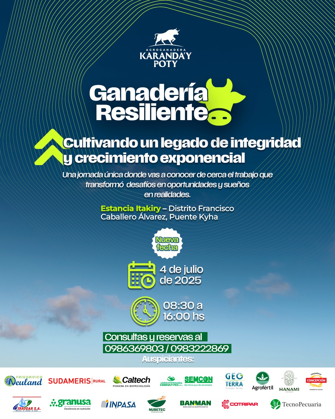 La Estancia Itakiry, ubicada en el distrito de Francisco Caballero Álvarez, departamento de Canindeyú, será sede este viernes 4 de julio de una jornada de campo centrada en la ganadería resiliente. El evento es organizado por Agroganadera Karanday Poty y cuenta con el respaldo de destacadas empresas del sector agropecuario.