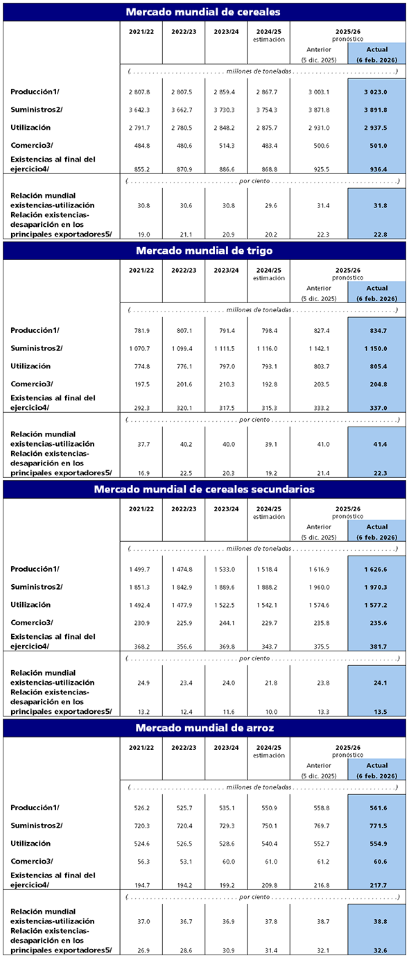 De cara a 2026, la FAO observa perspectivas mayormente favorables para el trigo en el hemisferio norte, con leves aumentos de superficie en la Unión Europea y el Reino Unido, mientras que en Rusia la menor humedad del suelo genera incertidumbre. En la India, los altos precios internos sostienen expectativas positivas, en contraste con Estados Unidos, donde los bajos precios redujeron la siembra y las condiciones del cultivo se deterioraron por la sequía.