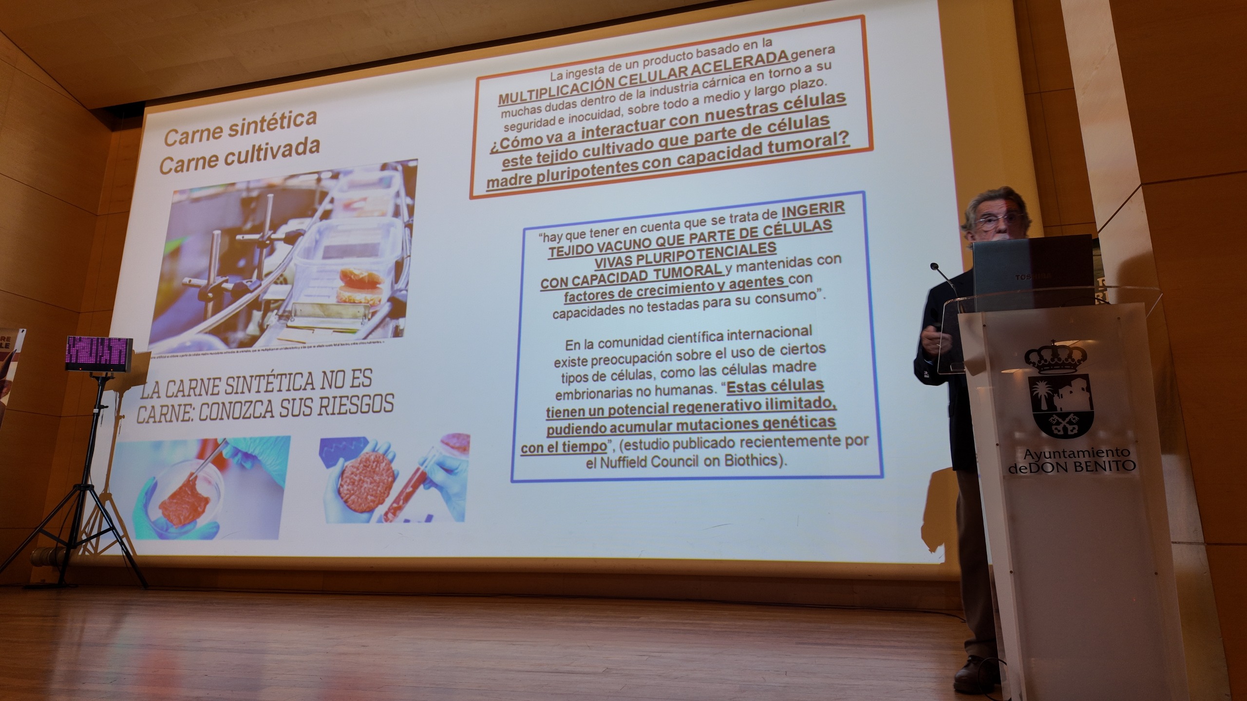 «La carne si lo comparamos con un equipo de futbol, es un jugador imprescindible, es decir, tiene que jugar en este equipo porque no se puede sustituir», afirmó, «nosotros llevamos consumiendo proteína animal como la carne, huevo, leche y pescado, sobre todo la carne desde hace millones de años, aproximadamente hace unos 4 o 5 millones, empezamos siendo carroñeros, luego fuimos cazadores e introdujimos el fuego y eso fue el cambio clave en la humanidad, sin ambas cosas en nuestra trazabilidad antropológica no estaríamos aquí, porque nos aportó una diferencia molecular que hizo que nuestro cerebro pasase de 400 centímetros cúbicos a 1500, y eso generó todo el conocimiento que hoy día tenemos», continuó.